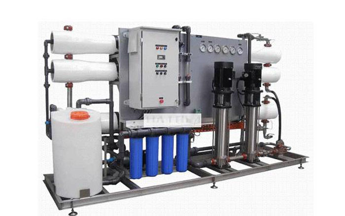 原水(設(shè)有壓力保護(hù))→增壓泵(一用一備)→砂過濾器→炭過濾器→硬化器(根據(jù)地區(qū)不合選用)→緊密過濾器(或稱保安過濾器)→兩頭水箱→一級RO高壓泵→一級RO反滲透零碎→RO水箱→二級RO高壓泵→二級RO水箱→增壓泵→EDI(CEDI)電去離子水(指除去了呈離子方式雜質(zhì)后的純水)主機(jī)→去離子水(指除去了呈離子方式雜質(zhì)后的純水)箱→去離子水(指除去了呈離子方式雜質(zhì)后的純水)泵→拋光混床→終端緊密過濾→UV紫外線殺菌→設(shè)備用水(水質(zhì)可以達(dá)到18MΩ.cm以上即0.055 μs/ ㎝以下,25 ℃)