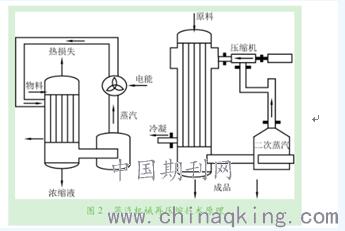 MVR系統(tǒng)主要由蒸發(fā)器和結(jié)晶器組成,廢水首先經(jīng)過(guò)蒸發(fā)器系統(tǒng)進(jìn)行濃縮,然后將循環(huán)結(jié)晶器進(jìn)一步的強(qiáng)制濃縮結(jié)晶。通過(guò)固液分離將鹽和水分開(kāi)后分別進(jìn)行回收利用。MVR技術(shù)的原理和工藝流程如圖2所示。高鹽廢水進(jìn)入蒸發(fā)器中的進(jìn)料罐,調(diào)節(jié)pH值至弱酸性后被送至逆流板式蒸餾水換熱器進(jìn)行加熱,溫度升至接近沸點(diǎn)時(shí),進(jìn)入除氧器。在除氧器內(nèi),噴灑在填料上的廢水逐級(jí)向下流動(dòng),與逆流而上的蒸汽相接觸,脫除不凝氣體,然后從底部排出,進(jìn)入蒸發(fā)器底槽,與循環(huán)的濃鹽水混合;旌虾蟮臐恹}水被送至蒸發(fā)器的頂部管箱并進(jìn)入垂直管道,沿管道內(nèi)壁均勻地呈薄膜狀下降。在這個(gè)過(guò)程中,一部分水吸收管外蒸汽釋放的熱能蒸發(fā),產(chǎn)生的蒸汽與未蒸發(fā)的濃鹽水一起下降至蒸發(fā)器底槽。蒸餾水流經(jīng)換熱器時(shí),對(duì)新進(jìn)的高含鹽廢水加熱。為控制蒸發(fā)器內(nèi)濃鹽水的總?cè)芙夤腆w含量,濃縮器底槽內(nèi)的部分濃鹽水被排放至結(jié)晶系統(tǒng)中進(jìn)行結(jié)晶處理。