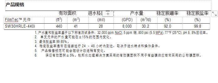 FilmTec™ SW30HRLE-440i 元件有著高脫鹽率和低能耗的組合特點,同時還有著最 高有效膜面積和寬進水流道,能夠為中等和高等鹽度進水的系統提供可持續的 低生命周期成本。FilmTec™ SW30HRLE-440i 元件有以下優點: