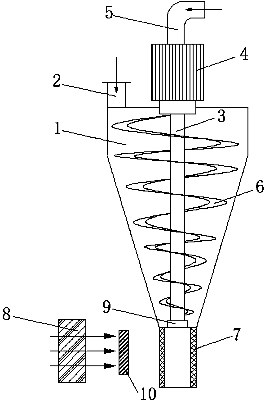 為實(shí)現(xiàn)上述目的,本發(fā)明提供如下技術(shù)方案:一種高效率化學(xué)廢水廢渣處理設(shè)備,包括反應(yīng)腔體,所述反應(yīng)腔體整體呈筒狀,且下部分筒體的內(nèi)徑長(zhǎng)度逐漸減小,所述反應(yīng)腔體的頂部一側(cè)開設(shè)有進(jìn)料口,所述反應(yīng)腔體的內(nèi)部中間位置還豎向裝設(shè)有轉(zhuǎn)動(dòng)軸,所述轉(zhuǎn)動(dòng)軸的頂端與外部的轉(zhuǎn)動(dòng)電機(jī)的轉(zhuǎn)子同軸連接,且轉(zhuǎn)動(dòng)電機(jī)的轉(zhuǎn)子與轉(zhuǎn)動(dòng)軸均為中空設(shè)計(jì),且相通連接,所述轉(zhuǎn)動(dòng)電機(jī)的轉(zhuǎn)子外部開設(shè)有除臭凈化液添加口,所述轉(zhuǎn)動(dòng)軸的外部周向螺旋安裝有攪拌葉片,所述反應(yīng)腔體的底部出料口外部裝設(shè)有脫水管道,所述脫水管道的側(cè)壁為網(wǎng)狀,所述脫水管道的側(cè)面裝設(shè)有鼓風(fēng)電機(jī)。