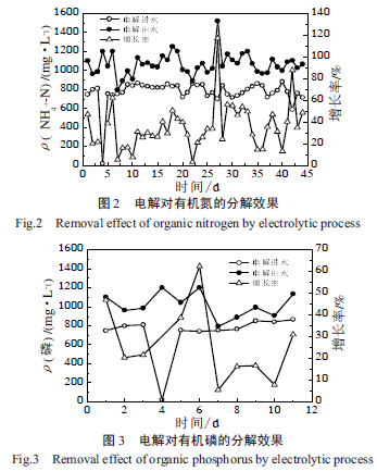 電解過(guò)程對(duì)廢水可生化性的提高作用,還表現(xiàn)在廢水中氨氮和無(wú)機(jī)磷濃度的增加,如圖2 和圖3所示,電解過(guò)程對(duì)有機(jī)氮的分解效果可使出水氨氮濃度水平平均增長(zhǎng)率達(dá)34.7%。對(duì)有機(jī)磷的分解效果則可使出水磷酸鹽磷濃度水平平均增長(zhǎng)率達(dá)26.7%,可見電解過(guò)程起到了部分分解有機(jī)物,降低了有機(jī)物濃度水平,同時(shí)電解后的混合液,氨氮和無(wú)機(jī)磷的濃度水平都有了一定幅度的提高,將使電解出水中C:N:P 的比例更適于生物降解,也即增加了廢水的可生化性。