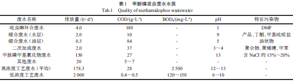 某公司所排放的甲胺磷廢水主要由甲胺磷等各種農(nóng)藥制劑生產(chǎn)過(guò)程中產(chǎn)生的廢水,如甲基氯化物、二甲胺、吡蟲啉等成分混合而成,pH 約為9~10,COD 范圍在20~30 g/L,鹽度大于15%, B/C比小于0.1,可生化性差,其中,高濃度甲胺磷有機(jī)廢水總量約178.3 m3/d,低濃度甲胺磷生產(chǎn)廢水總量約2 000 m3/d。