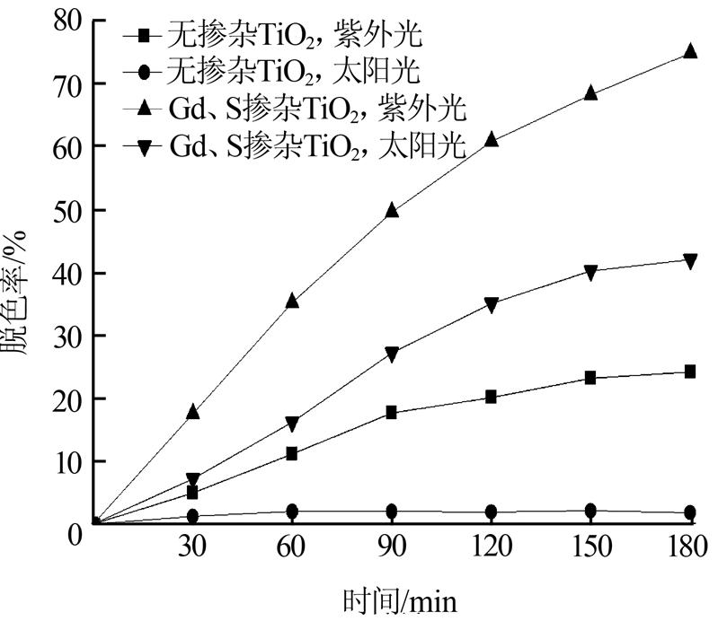 由圖 1可知,對于無摻雜TiO2,在可見光照射下,脫色率很低,可以忽略不計。對于摻雜釓0.2%、硫1.0%的TiO2試樣,在可見光下有較為明顯的效果,說明釓、硫共摻雜產生協同效應降低了半導體禁帶寬度,擴展了TiO2的光響應范圍,改善了TiO2的光催化性能。TiO2中摻雜的Gd3+還可以作為一種電子捕獲劑〔14〕,促進表面氧空穴的形成,非金屬摻雜后在價帶上方形成了一個新的能級,使二氧化鈦的帶隙變窄,從而能夠吸收更多的可見光,提高光催化的效率。而在紫外燈下,釓、硫共摻雜TiO2的光催化效果明顯提高,紫外照射3 h后,對大紅染料的脫色率達到了74.8%,相對無摻雜TiO2提高了50.6%。