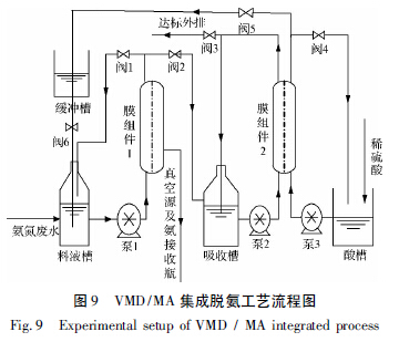 含氨廢水預先用0. 2 mol /L 的NaOH 溶液調節pH 至10. 5 后引入真空脫氨料液槽中,由真空脫氨循環泵1 泵入PP 脫氣膜組件1 的內側,脫氨后返回料液槽,當脫氨效率達到80% 以上時關閉閥門1 開啟閥門2 將VMD 處理后的料液引入MA 吸收槽中。重新調整pH 為10.5 后泵入PP 脫氣膜組件2 內側進行膜吸收脫氨后返回吸收槽,直到脫除效率達到目的值時,開啟閥門3,調節pH 為中性后達標外排。酸循環槽內起始濃度為0. 02 mol /L 的稀硫酸吸收劑被泵入PP 脫氣膜組件2 的膜外側,帶走過膜氨分子回到酸槽,生成硫酸銨。當稀硫酸吸收劑pH 大于4 時開啟閥門5 關閉閥門4,將硫酸銨溶液引入吸收劑緩沖槽,調節至所需pH 后開啟閥門6 流入真空脫氨料液循環槽中與含氨廢水混合繼續脫氨。在脫氣膜組件1 中膜另一側接氨回收真空系統為VMD 工藝提供動力,由膜組件1 脫除的氨被氨接收瓶冷凝接收。
