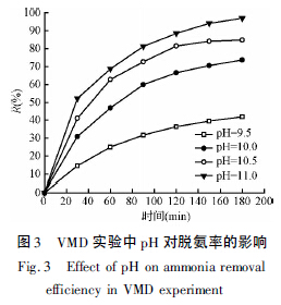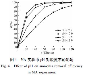 配制濃度為1 000 mg /L 的料液,控制兩側循環流速都為0. 10 m/s,料液進口溫度40℃,稀硫酸吸收液進口溫度20℃,濃度0. 02 mol /L,調節料液pH分別為9. 50、10. 0、10. 5 和11. 0 進行MA 實驗,結果如圖4 所示。