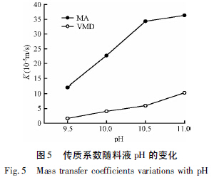 如圖5 所示,pH 值對VMD 和MA 實驗的傳質系數影響很大,K 值先開始迅速提高后又趨于緩慢增加,隨著pH 由9.50 增大到11.0,2個膜過程的K值分別由1. 64 × 10-5 m/s、12.11 × 10-5 m/s 升高到了10.33 × 10-5 m/s、36.33 × 10-5 m/s,分別提高到初始K 值的6.3 倍和3.0 倍。這種現象可以通過NH3在水溶液中的電離平衡解釋,提高溶液的pH值,OH-濃度增大,平衡方程h2o向右移動,生成的氨氣越多,從而提高了膜兩側的蒸氣壓差,提高了傳質動力,導致K 值增大。