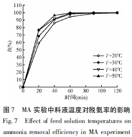 配制濃度為1 000 mg /L、pH 為10. 5 的料液,控制兩側循環流速都為0.10 m/s,稀硫酸吸收液進口溫度20℃,濃度0. 02 mol /L,調節料液進口溫度分別為20、30、40 和50℃進行MA 實驗,結果如圖7 所示。