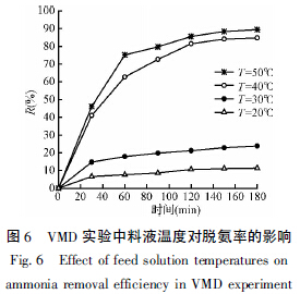 料液進口溫度對VMD 脫氨實驗過程的影響很顯著,隨著溫度的增加,脫氨速度和效率明顯提高,當溫度設置在20℃和30℃時脫氨效率較低。在料液進口溫度達到40℃時,VMD 脫氨效率明顯提高,料液進口溫度調節到50℃脫氨效率進一步提高,但過高初始料液溫度會導致整個工藝能耗大大增加。