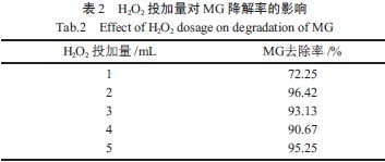 H2O2投加量對MG 降解率的影響如表2 所示。由表2 可知,當H2O2投加量從1 mL 增加至2 mL時,孔雀石綠的降解率從72.25%提高到96.42%,而當H2O2投加量增加至3 mL 和4 mL 時,降解率出現了降低情況,繼續增加H2O2投加量,降解率又出現上升趨勢。微波輻射環境下,通過催化劑的協同作用,H2O2分解產生·OH,促使了孔雀石綠降解。所以在反應之初孔雀石綠的降解率隨H2O2投加量的增加而上升,但同時H2O2本身又是·OH 的猝滅劑,當投加量過多也會促使·OH 猝滅;生成的·OH 發生自聚合反應重新生成H2O2,導致孔雀石綠染料的降解率出現下降趨勢。當繼續增加H2O2投加量,微波作用使孔雀石綠分子中各原子間鍵能受到削弱,非·OH氧化機制將在孔雀石綠降解過程中發揮重要作用,所以微波作用下較大H2O2投加量也可獲得較高的降解率。由于H2O2有一定的使用成本,因此H2O2用量越少就越節約成本;但是,若H2O2用量過低,微波作用時間過長,會增加能量消耗。故H2O2投加量為2 mL。