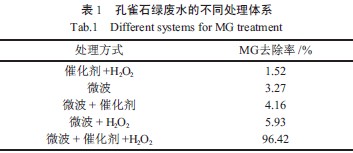 由表1 可知,催化劑+H2O2、微波、微波+ 催化劑、微波+ H2O2體系對孔雀石綠去除率很低,反應5min 后去除率比較高僅達到5.93%。微波+ 催化劑+H2O2體系使孔雀石綠降解達到了很好的效果,處理5 min 后,孔雀石綠降解率達到96.42%。