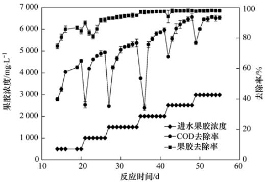 圖 2馴化期果膠濃度對系統(tǒng)去除率的影響
