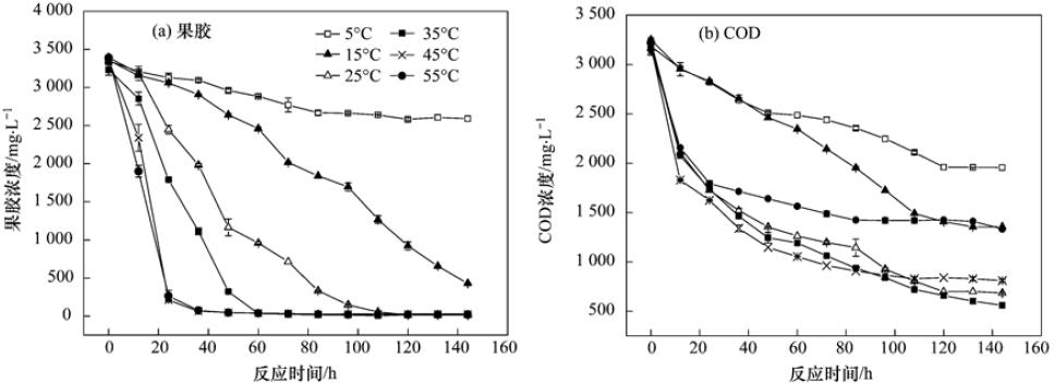 (3)溫度越高,降解果膠所需的時(shí)間越短. 5℃時(shí),降解144 h后,出水果膠濃度為2?589.6 mg ·L-1,而溫度為55℃時(shí)僅需36 h,出水果膠濃度可在80 mg ·L-1以下. 隨著溫度在5~35℃范圍內(nèi)變化,厭氧污泥對果膠廢水中COD的去除率從38.6%逐漸增加到91.5%,當(dāng)溫度高于35℃時(shí),厭氧污泥對果膠廢水中COD的去除率逐漸降低.