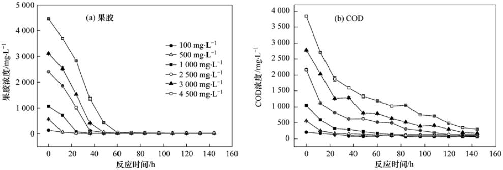 (2)馴化污泥能夠降解初始濃度大于4?500 mg ·L-1的果膠廢水.果膠濃度越高,降解速率越快. 果膠濃度為100和500 mg ·L-1時(shí),果膠降解速率分別為4.5和23.1 mg ·(L ·h)-1,而濃度為2?500和4?500 mg ·L-1的果膠廢水,降解速率分別為49.8和74.0 mg ·(L ·h)-1.果膠初始濃度低于500 mg ·L-1,COD去除率較低,僅為41.6%~82.0%.果膠初始濃度高于1?000 mg ·L-1,COD去除率穩(wěn)定在91%以上.