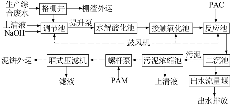 生產廢水中含有的較大藥渣、漂浮物顆粒經過前置的格柵攔截后得到有效去除,廢水經格柵井后自流入調節池進行初步的勻質、勻量,同時在調節池內由計量泵添加一定濃度的堿液,將廢水的pH由初始的4.0~6.0調整為7.0~9.0;在調節pH的同時需利用羅茨鼓風機往池內曝氣,主要是因為在調節池內對廢水進行預曝氣及攪拌可以盡可能地避免大量SS在調節池內堆積和發酵,同時還能夠將廢水中的低分子有機污染物吹脫氧化。隨后由潛污泵提升至水解酸化池。在水解酸化池中得到馴化、培養的大量厭氧微生物,則直接將廢水中所含的大部分高分子有機污染物破碎降解為小分子有機污染物,進而提高廢水的可生化性,有效地緩解后續好氧生化處理工序的處理壓力。廢水經水解酸化處理后自流進入接觸氧化池,接觸氧化池中的好氧微生物種群及硝化菌菌群在池內羅茨鼓風機曝氣充氧的情況下,大量的有機污染物被好氧微生物種群氧化降解為CO2和H2O,廢水中的氨氮則被氧化為硝酸鹽和亞硝酸鹽得以去除。經接觸氧化池處理后的出水還需通過外加聚合氯化鋁(PAC)進行比較終的混凝沉淀反應,作用是使廢水中不易沉淀的細小顆粒絮體凝聚形成大顆粒絮體,混合液隨后進入二沉池內進行固液分離,保證比較終出水水質穩定達到排放標準要求。固液分離后的上清液溢流進入出水流量堰可達標排放,剩余污泥則排入污泥濃縮池進行污泥濃縮處理。