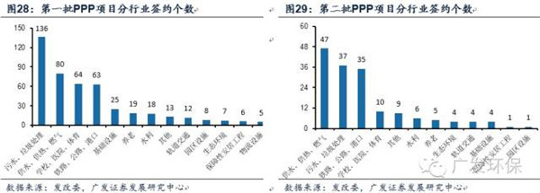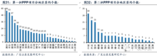 落地項目集中在市政、公共服務領域,占比約半數。從行業分布看,兩批簽約的項目主要集中在市政、公共服務及交通等領域,其中污水處理、公用事業等基建投資項目數占比約48%(兩批項目合計比例)。總共簽約的619個項目中,污水、垃圾處理項目173個,占28%;供水、供熱、燃氣等項目127個,占20%;鐵路、公路、港口等項目98個,占16%;學校、醫院、體育等項目74個,占12%。值得關注的是,第二批簽約項目中,學校、醫院、體育等項目僅有10個,比批減少了54個。這可能與地方財政收入有限,導致政府付費為主的PPP項目減少有關。