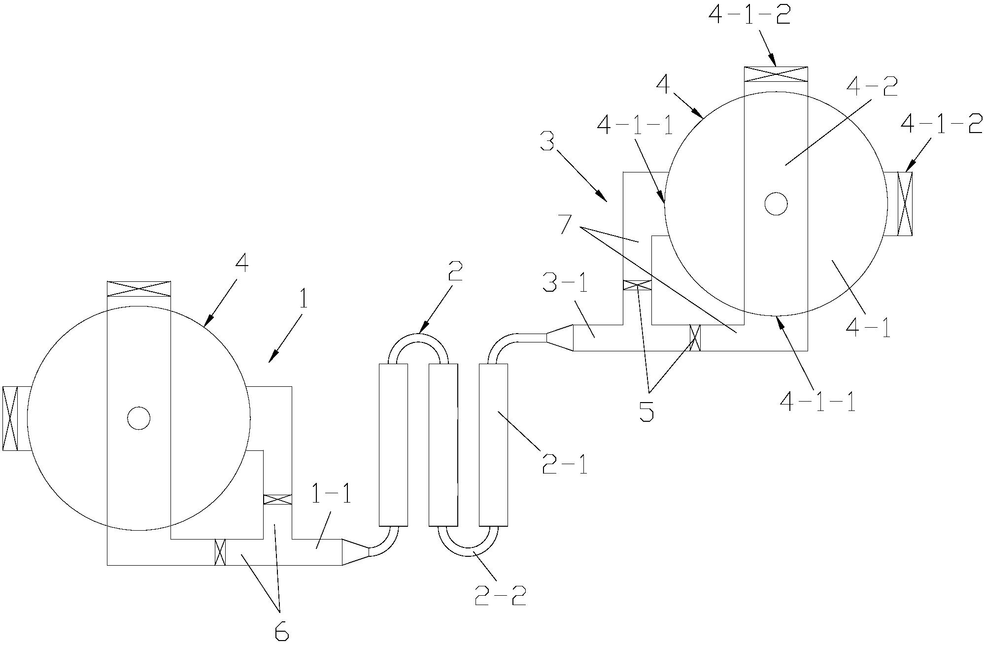 所述進(jìn)水機(jī)構(gòu)(1)具有進(jìn)水管(1-1),所述出水機(jī)構(gòu)(3)具有出水管(3-1),所述進(jìn)水機(jī)構(gòu)(1)和出水機(jī)構(gòu)(3)均具有接頭組件(4),所述接頭組件(4)包括轉(zhuǎn)接盤(4-1)和轉(zhuǎn)接管(4-2),所述轉(zhuǎn)接盤(4-1)為圓盤形,所述轉(zhuǎn)接管(4-2)為柱形,所述轉(zhuǎn)接管(4-2)位于轉(zhuǎn)接盤(4-1)內(nèi)部,且轉(zhuǎn)接管(4-2)的中點(diǎn)位于轉(zhuǎn)接盤(4-1)的圓心位置,轉(zhuǎn)接管(4-2)的兩端部與轉(zhuǎn)接盤(4-1)內(nèi)壁動(dòng)密封連接;所述轉(zhuǎn)接盤(4-1)上具有兩個(gè)接管口(4-1-1)和兩個(gè)外接口(4-1-2),兩個(gè)接管口(4-1-1)相互間隔90°,兩個(gè)外接口(4-1-2)相互間隔90°,且每個(gè)接管口(4-1-1)相對(duì)設(shè)置一個(gè)所述的外接口(4-1-2);