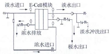 (2)因?yàn)镋DI 模塊系統(tǒng)為直通逆流設(shè)計(jì),即淡水及極水進(jìn)口設(shè)置在模塊底部,出口都設(shè)置在頂部,極水流由淡水流進(jìn)口供給,濃水進(jìn)口設(shè)置在模塊頂部,因此運(yùn)行過程中,為了防止?jié)馑Z入產(chǎn)品水,通過控制濃水進(jìn)口閥來調(diào)節(jié)濃水進(jìn)口與淡水出口之間的壓力差,嚴(yán)格控制淡水產(chǎn)水壓力至少比濃水進(jìn)口壓力大0.035 MPa,EDI 系統(tǒng)示意如圖 3 所示。