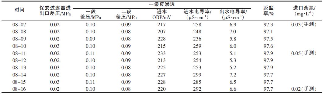 (5)反滲透系統(tǒng)運(yùn)行結(jié)果如表 2、表 3 所示。