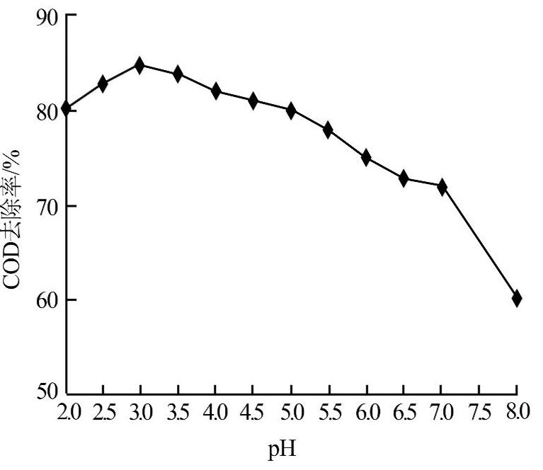 由圖4可以看出,在酸性條件下,隨pH的增加,廢水COD去除率增加,在pH=3.0時有比較佳效果。當(dāng)pH小于3.0時,鐵屑與酸反應(yīng)生成的氫氣大量覆蓋在鐵屑的表面,減小了鐵屑的有效表面積,降低了原電池效應(yīng),從而使處理效果下降。而且溶液pH過低,會破壞絮凝體,使溶液因Fe2++和Fe3++濃度增大而色度增加。當(dāng)pH大于3.0時,H+濃度逐漸降低,陰極的反應(yīng)效果也下降。所以選擇適宜的進(jìn)水pH為3.0。