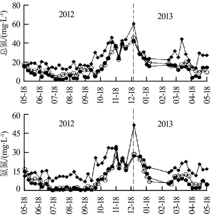 實驗從2012年5月18日至2013年5月18日為期1 a。為了研究植物和基質級配對營養物去除效果的影響,在距離濕地進水口水平方向的1/4、2/4和3/4處分別采集深度為7.5、25、45 cm(各種級配基質的中間層)的水樣。濕地進出水水樣每周取一次,DO采用HQ30d便攜式溶解氧測定儀(美國哈希公司)測定,TN、NH3-N、NO3--N、NO2--N、TP、PO43--P、COD、BOD5和SS按照《水和廢水監測分析方法》〔8〕測定。濕地植物于2012年5月26日基本長出,于2012年10月5日收割,生長期為132 d。收割時保留植物根部及基質以上10 cm的莖稈。植物樣品的氮磷含量采用H2SO4-H2O2消解法測定〔9〕。