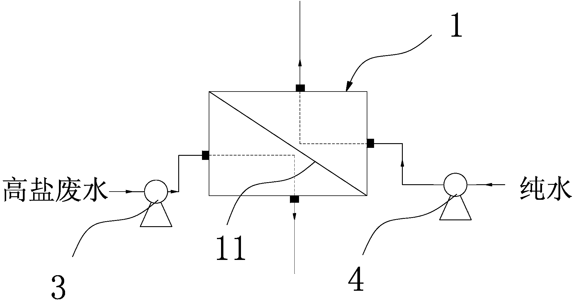 A、通過水泵一(3)將高鹽廢水輸送到納濾設備;通過水泵二(4)將純水輸送至納濾設備,再使高鹽廢水和純水分別從納濾設備中的納濾膜(21)兩側流經納濾膜(21)進行納濾;所述納濾設備中的納濾膜(21)一側流經高鹽廢水的為高鹽廢水側;所述納濾設備中的納濾膜(21)另一側流經純水的為純水側;所述高鹽廢水從納濾設備中的高鹽廢水側流入和排出;所述純水從納濾設備中純水側流入和排出;