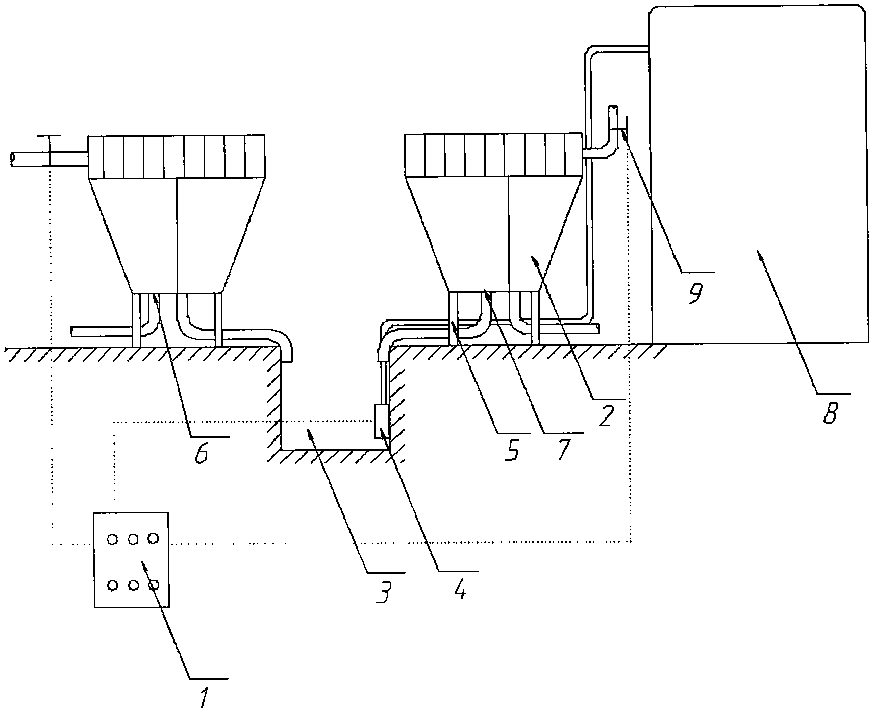 本實用新型的有益效果:1、本實用新型壓濾機采用了全自動控制,節省了人力,加快了污泥和水分離的效率。2、本實用新型在壓濾間設計了一個壓濾水收集池,使壓濾水抽回PH調整池繼續處理,避免對環境造成污染。