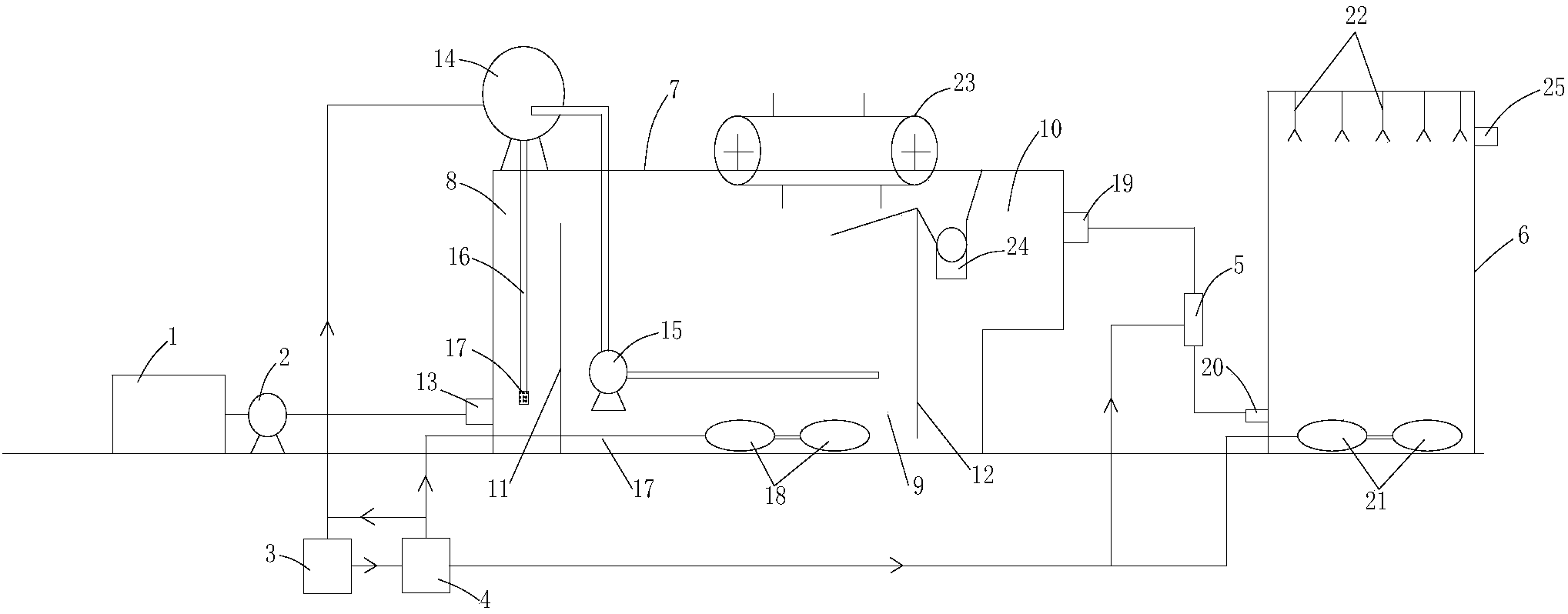 優(yōu)選地,所述溶氣罐上設(shè)置有進水口和進氣口,進水口通過回流泵與氣浮區(qū)的下部相連接,進氣口分別與制氧機和臭氧發(fā)生器相連,制氧機產(chǎn)生的氧氣和臭氧發(fā)生器產(chǎn)生的臭氧在管路內(nèi)混合后自進氣口進入溶氣罐內(nèi)。