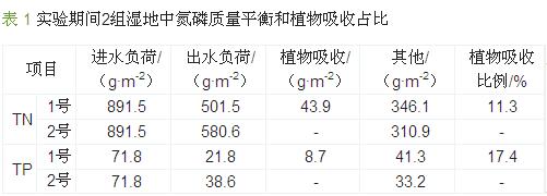 秋季對1號濕地中的植物進(jìn)行收割,通過測量植物干重和植物內(nèi)的氮磷含量,得到實(shí)驗(yàn)期間通過植物吸收所去除的營養(yǎng)物總量,并與2號濕地進(jìn)行對比,結(jié)果如表 1所示。