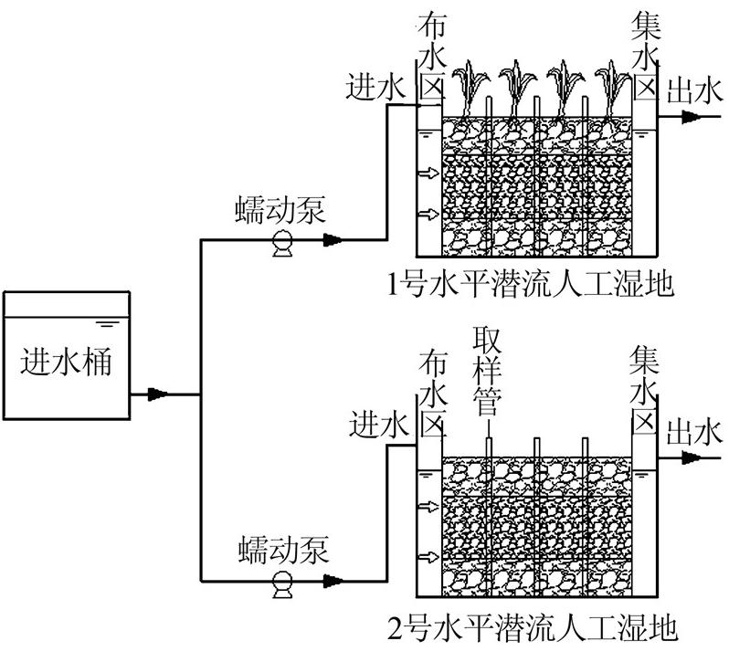 于西安建筑科技大學(xué)校內(nèi)構(gòu)建2組結(jié)構(gòu)相同的由有機(jī)玻璃構(gòu)成的水平潛流人工濕地(尺寸均為0.75 m×0.4 m×0.8 m)。為了獲得較好的水力性能和處理效果,實(shí)驗(yàn)采用了不同粒徑的填料組成,其礫石粒徑配比從下到上為15 cm大粒徑(d:15~30 mm)、25 cm小粒徑(d:5~15 mm)、15 cm大粒徑(d:15~30 mm),基質(zhì)孔隙率為50%。1號濕地為種植蘆葦?shù)乃綕摿鳚竦兀N植密度為13株/m2,2號濕地為未種植植物的空白水平潛流濕地。礫石、蘆葦均取自西安皂河附近。