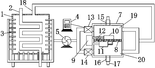 1.一種電極箔生產(chǎn)用水處理系統(tǒng),包括保溫箱(1)、水管(2)、PLC控制器(4)、引風(fēng)機(jī)(5)和冷熱制造箱(7),其特征在于:所述水管(2)穿過保溫箱(1),且在保溫箱(1)內(nèi)部的水管(2)呈折疊狀設(shè)置,所述保溫箱(1)的側(cè)壁與底端均安裝有進(jìn)氣支管(3),所述進(jìn)氣支管(3)的進(jìn)氣口通過管道與引風(fēng)機(jī)(5)的出氣口連通,所述冷熱制造箱(7)內(nèi)部安裝有隔熱板(8),所述隔熱板(8)的上端和下端分別為制冷腔(19)和制熱腔(20),所述隔熱板(8)的上端和下端分別安裝有蒸發(fā)器(10)和冷凝器(11),所述冷熱制造箱(7)的外壁安裝有壓縮機(jī)(9),所述壓縮機(jī)(9)通過管道分別與蒸發(fā)器(10)和冷凝器(11)連通,所述蒸發(fā)器(10)和冷凝器(11)通過毛細(xì)管連通,所述壓縮機(jī)(9)與蒸發(fā)器(10)之間的管道上安裝有電磁閥(12),所述制冷腔(19)和制熱腔(20)的出氣口通過分別均與引風(fēng)機(jī)(5)的進(jìn)氣口連通,所述制冷腔(19)和制熱腔(20)的出氣口處分別安裝有第二電磁閥(13)和第三電磁閥(14),所述制冷腔(19)和制熱腔(20)進(jìn)氣口通過管道均與保溫箱(1)上端的出氣管(18)連通,所述引風(fēng)機(jī)(5)、壓縮機(jī)(9)、電磁閥(12)、第二電磁閥(13)和第三電磁閥(14)均與PLC控制器(4)電性連接。
