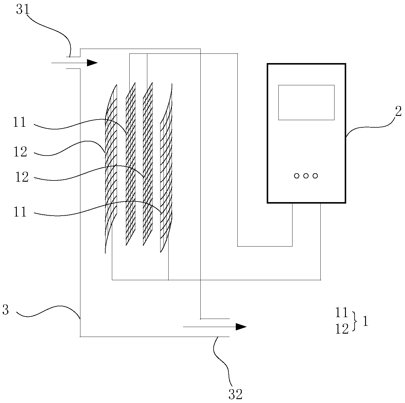 2.如權利要求1所述的水處理的鈣鎂離子吸附自動剝離器,其特征在于:每個所述電極組中的類電極和第二類電極的數量均為兩個,且兩個所述類電極位于兩個所述第二類電極之間,四個所述電極間隔排布。
