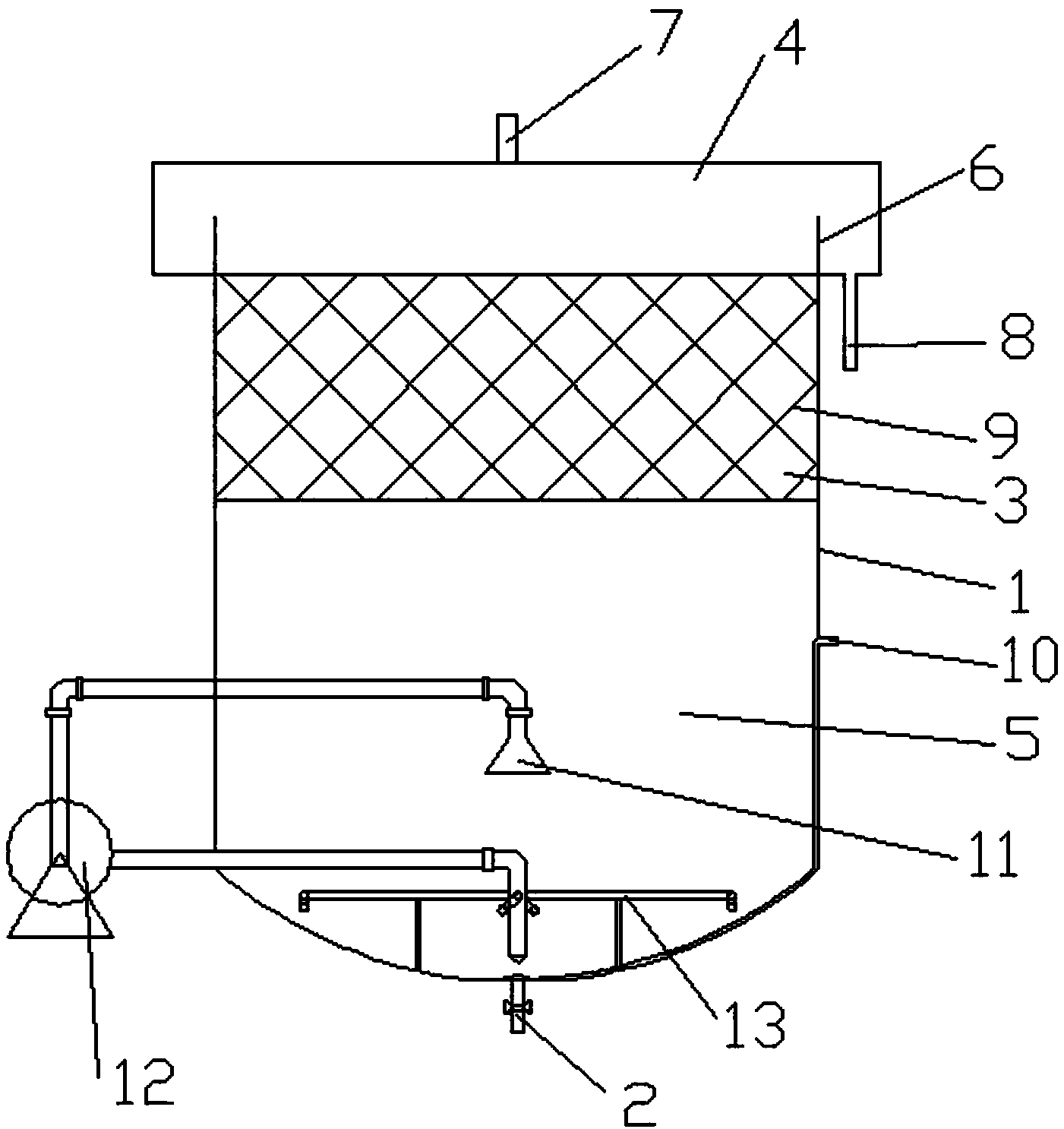 本實用新型,一種污水處理厭氧反應(yīng)器:儲存于廢水箱的污水由恒流泵打入反應(yīng)器后,首先進(jìn)入射流布水器并在其中得到均勻分配,從而達(dá)到布水均勻的目的。當(dāng)間歇操作的水力循環(huán)裝置運行時,到達(dá)倒漏斗取水口下方的泥、水、氣混合液在循環(huán)泵的強大動力作用下,由倒漏斗取水口吸入循環(huán)管,經(jīng)循環(huán)泵打入布水系統(tǒng)而重新均勻分配到反應(yīng)器池底,同時池底因為具有一定的弧度而不易產(chǎn)生死角。水流上升,當(dāng)混合液與填料層碰撞后,氣體首先逃逸,由反應(yīng)器頂端的排氣口排出并收集利用,厭氧污泥因為自身的重力作用和填料層的攔截作用而發(fā)生沉淀使水質(zhì)變得澄清,經(jīng)溢流堰溢流后從出水口排出。