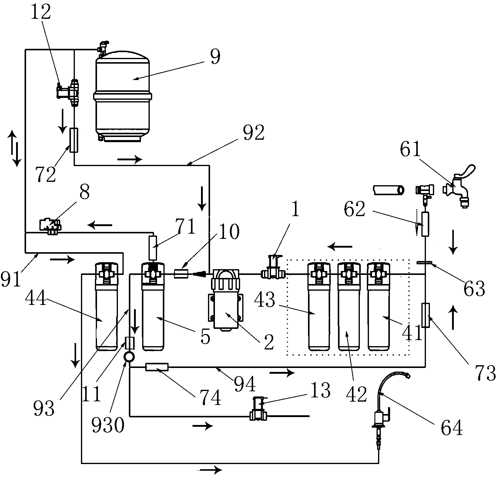 進(jìn)一步地,制水時(shí),控制模塊控制進(jìn)水電磁閥、增壓泵工作,濃水電磁閥關(guān)閉,原水經(jīng)由前置濾芯、進(jìn)水電磁閥、增壓泵進(jìn)入RO濾芯過濾后從純水出口排出。