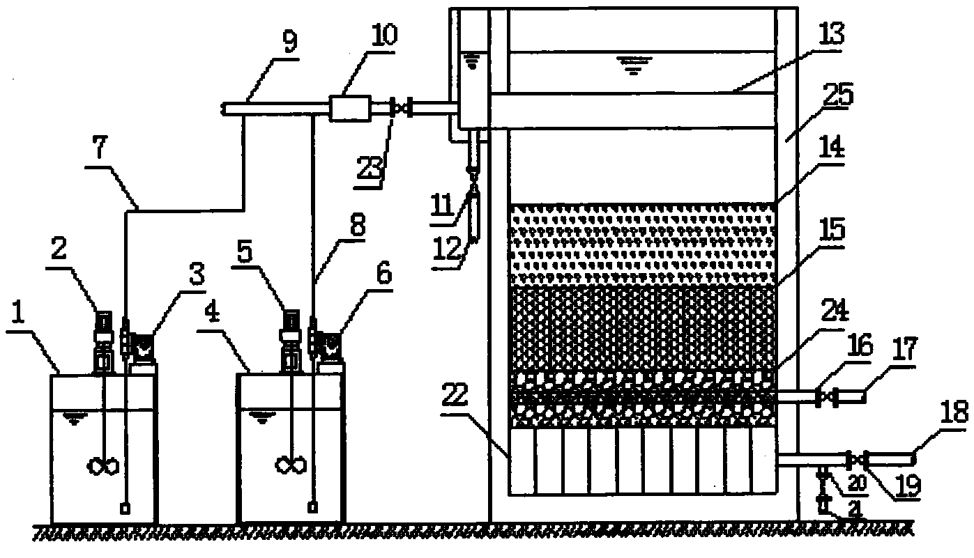 1.一種下向流零價鐵類芬頓-生物濾池集成化廢水處理設備,其特征在于,包括帶硫酸投藥泵(3)的硫酸溶藥池(1)、帶雙氧水投藥泵(6)的雙氧水溶藥池(4)及濾池(25),硫酸溶藥池(1)、雙氧水溶藥池(4)分別通過硫酸投藥管(7)、雙氧水投藥管(8)與廢水進水管(9)連通,廢水進水管(9)依次通過混合器(10)、廢水進水調(diào)節(jié)閥(23)與濾池(25)頂部的進水渠(13)的進水口連接,反沖洗排水管(12)通過反沖洗排水調(diào)節(jié)閥(11)也與進水渠(13)的進水口連接;濾池(25)內(nèi)從上至下依次填充有鐵刨花濾層(14)、生物陶粒濾層(15)、承托層(24)、多孔濾磚(22),濾池(25)側壁位于承托層(24)處設有曝氣管(17),曝氣管(17)上設有曝氣管調(diào)節(jié)閥(16);濾池(25)側壁位于多孔濾磚(22)處設有出水管(18),出水管(18)上設有出水管調(diào)節(jié)閥(19),出水管調(diào)節(jié)閥(19)與濾池(25)側壁之間設有反沖洗進水管(21),反沖洗進水管(21)上設有反沖洗進水管調(diào)節(jié)閥(20)。