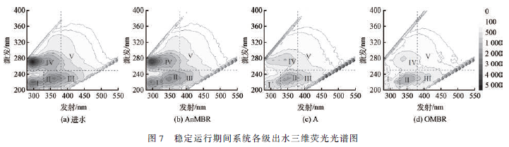 各級出水的熒光峰數量和主要熒光峰的強度變化如表3 所示。由統計結果看出,從進水到AnMBR出水,熒光峰數從58 減少到56,主要熒光峰強度下降15% 左右,與此級的COD 去除率大致相等,而熒光峰熒光強度的總和(ΣFI)增幅較小,可能與此級的COD 降解率較高有關。經過A 和OMBR 處理,OMBR出水的熒光峰數明顯增加但ΣFI 大幅下降,可能與有機污染物經過系統處理后被降解成更多的小分子物質有關。此外,OMBR 出水Ⅰ、Ⅳ區的主要熒光峰強度均大幅下降為進水的17% 和21% ,而Ⅱ區的主要熒光峰強度仍為進水的57. 5% ,是OMBR 出水中強度比較高的熒光峰。
