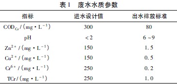 該工程的處理廢水為電鍍綜合廢水。改造工程的設計水量為500m3/d (其中含氰廢水100m3/d) ,水質水量波動較大(水量日變化系數為3,進水COD 范圍100~300mg/L) 。具體參數見表1。