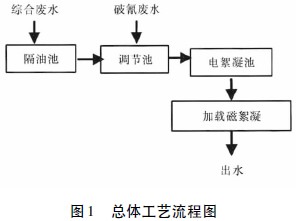 電鍍綜合廢水首先經過隔油池隔油后進入調節池與破氰后的廢水混合調節pH 值3~4,泵入電絮凝池,利用高頻高壓脈沖電源在水中通電發生電化學反應,產生氧化、還原、絮凝和氣浮等四種效應,降解COD 和形成金屬氫氧化物,再進入加載磁絮凝池調整pH 到8. 5~9,加載磁粉加快泥水分離,上清液水質達到出水排放標準。
