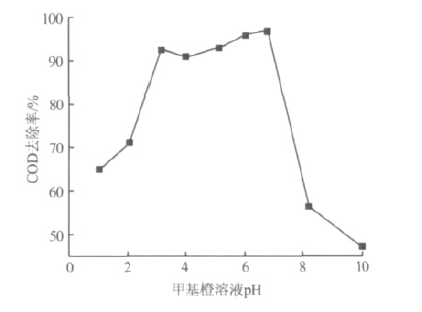 實驗結果表明,當pH 在3~7 時,脫色率和COD 去除率可分別保持在90%和95%左右;單獨考慮脫色率時,pH=2 時為比較佳。