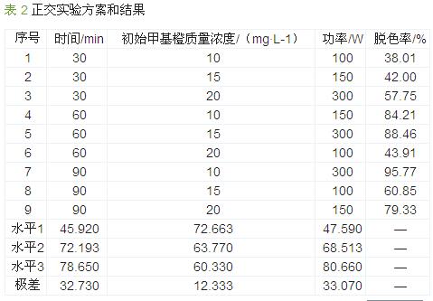 (2)正交實驗。以超聲作用時間、甲基橙初始濃度及超聲功率為影響因素,以脫色率為評價指標進行正交實驗,考察各因素對處理效果的影響。