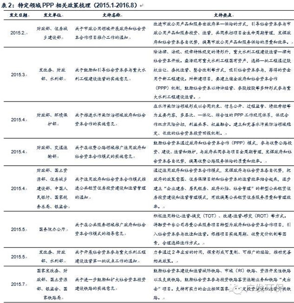 加大在特定領(lǐng)域開展PPP的政策扶持力度。2015年2月,財政部聯(lián)合住建部就市政公用領(lǐng)域開展PPP下發(fā)文件,引導(dǎo)社會資本參與市政公用產(chǎn)品和服務(wù)供給。3月,發(fā)改委、財政部、水利部聯(lián)合推進(jìn)重大水利工程建設(shè)運營向社會資本開放。4月,財政部、環(huán)保部就水污染防治領(lǐng)域PPP工作規(guī)范體系的建立提出實施意見;財政部、交通運輸部推廣在收費公路領(lǐng)域的PPP模式開展。除此之外,財政部相繼又聯(lián)合國土資源部等部委,分別就公共租賃住房、鐵路建設(shè)、城市停車設(shè)施建設(shè)等領(lǐng)域推廣運用PPP模式下發(fā)指導(dǎo)性文件,引導(dǎo)PPP模式在特定領(lǐng)域的推廣,全方位推動PPP發(fā)展。