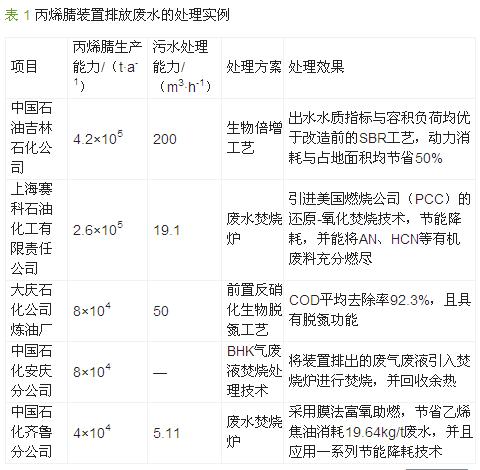 丙烯腈(AN)是一種重要的化工原料,廣泛應(yīng)用于合成纖維、合成樹脂及合成橡膠等領(lǐng)域。2010 年我國丙烯腈的總產(chǎn)量達(dá)到約109 萬t,比2009 年增長約11.8%〔1〕。丙烯腈生產(chǎn)過程中會排放大量廢水,廢水中主要含有丙烯腈、乙腈、丙烯醛等物質(zhì),其中腈化物為劇毒物,丙烯腈和丙烯醛是美國環(huán)境保護(hù)署規(guī)定的優(yōu)先污染物,若該廢水直接排放,必定會對人類和環(huán)境產(chǎn)生巨大的危害,故對丙烯腈生產(chǎn)廢水的處理至關(guān)重要,部分丙烯腈裝置排放廢水的處理實(shí)例如表 1 所示〔2, 3, 4, 5, 6〕。