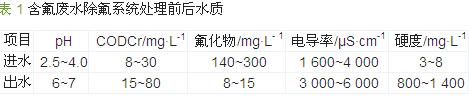 企業三期滿負荷生產情況下日產生含氟廢水4 500 m3,含氟廢水處理系統設計處理水量為4 800 m3/d。含氟廢水經除氟處理前后水質見表 1。