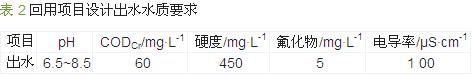 針對企業含氟廢水水質特點,決定將準備回用處理的含氟廢水處理后回用到純水站代替新鮮水制備純水供應到生產中,回用處理系統濃水排到原有除氟處理設施處理達標后排放。回用水質需滿足《城市污水再生利用 工業用水水質》(GB/T 19923—2005)表 1中工藝與產品用水的水質標準要求,同時滿足特征指標氟化物質量濃度低于5 mg/L、電導率低于100 μS/cm的要求。本項目設計出水水質要求見表 2。