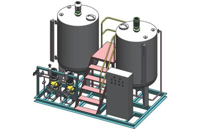 2、加藥裝置組成結(jié)構有:溶液箱、液位計、計量箱、攪拌器、加藥計量泵、安全閥、壓力表、控制柜、閥門以及管路集中布置,各部件的材質(zhì)主要分不銹鋼和碳鋼襯膠。