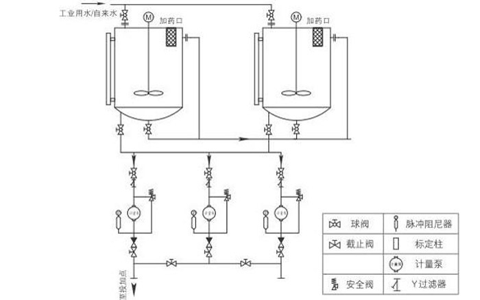 磷酸鹽加藥裝置主要由溶液箱、計量泵、安全閥、液位計、針型閥、球閥、攪拌器、Y型過濾器、底盤等部件組成。投用時將固體磷酸鹽加入溶液箱內(nèi),然后按比例注入除鹽水或凝結(jié)水開動攪拌器攪拌幫助溶解,成品磷酸鹽溶液由計量泵注入鍋爐汽包內(nèi)。加藥的運(yùn)行工況均根據(jù)爐水的硬度來確定加藥方式。操作方式分為手動控別方式,也可依據(jù)上位系統(tǒng)輸出的控制信號,進(jìn)行自動控制,實現(xiàn)自動加藥。